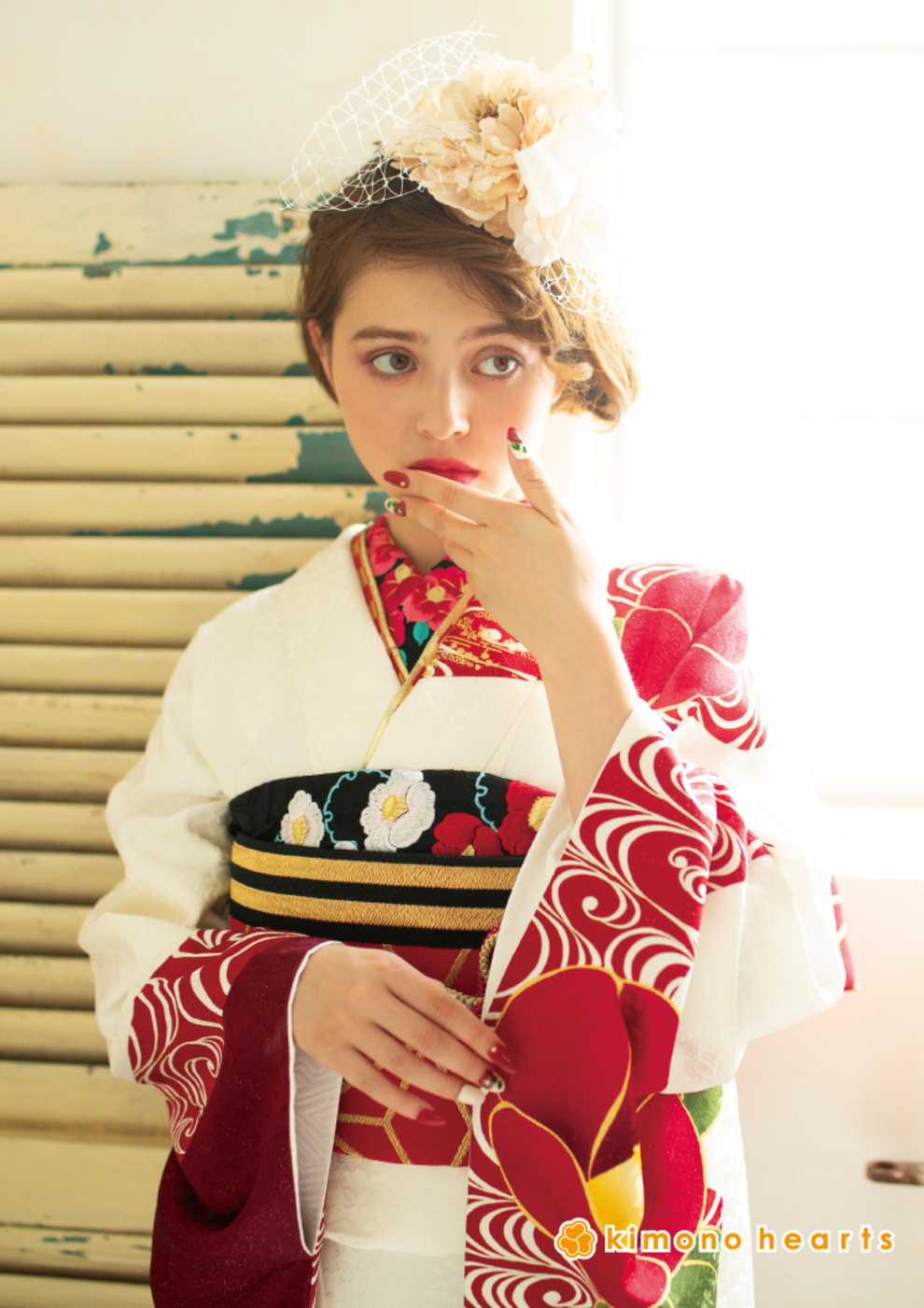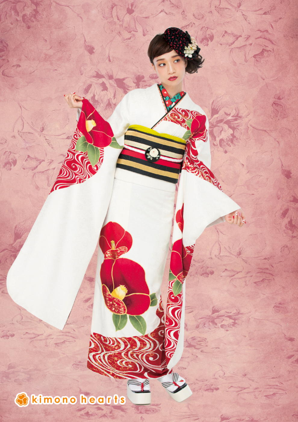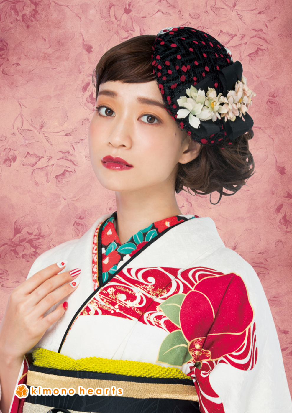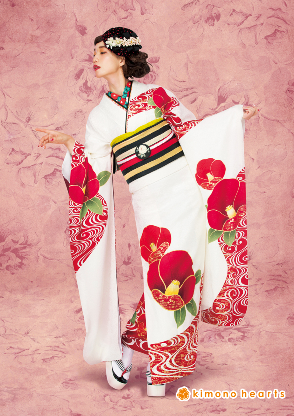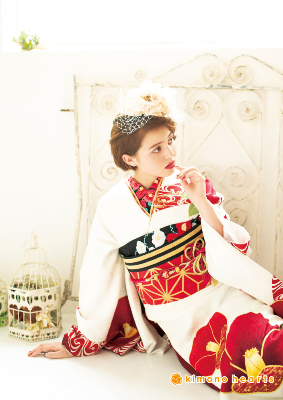 白に咲く赤椿が可憐。 柄の半衿でアンティーク度UP! 柄:椿/流水紋 色:赤/白 hair:クラシカルなサイドのまとめ髪に、チュールネットとフレンチシャビーな髪飾りがマッチ。