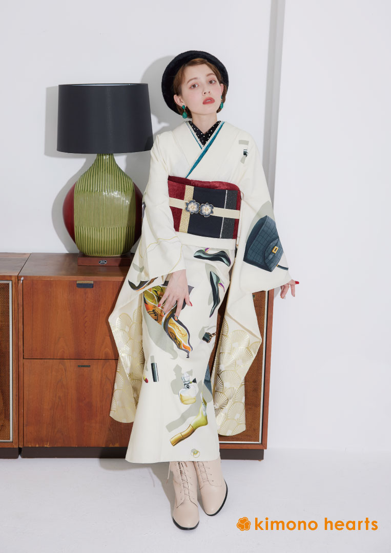 白地に転がるピンヒールやパフュームボトル。どことなくアーティスティックなデザインの 異質の組合せはダリのアートを彷彿させます。 ときめき溢れるモチーフを纏って、主役の日をとことん楽しんで。