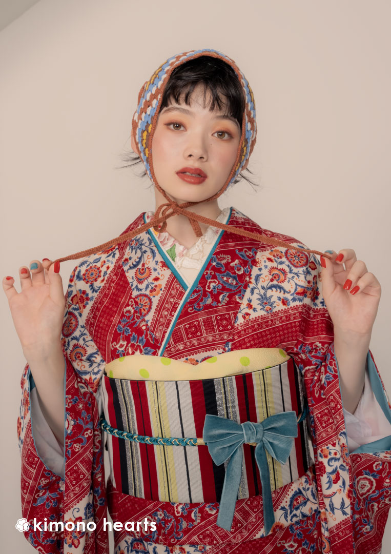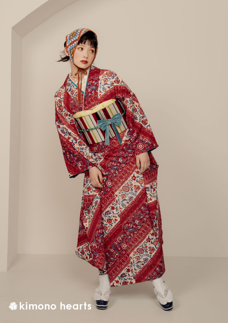 大正時代の本物のアンティーク生地からデザインをうつし復刻したキモノハーツオリジナルの振袖。更紗模様に明るく華やかな色味が北欧のファブリックやチロリアンリボンをイメージさせるカラーリングの振袖。カラフルな色使いとポップな柄が楽しめるコーディネートです♪ちょっとキャンディーのように見えるのも可愛いですね