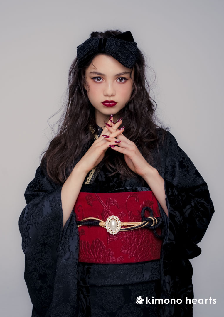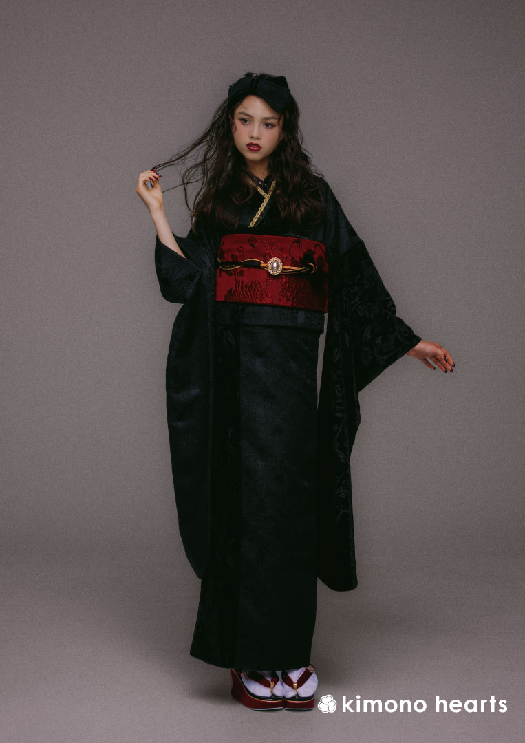 ベロア生地が珍しい異素材の振袖。よく見てみると様々な柄が浮かび上がり、見るたびに新しい顔を見せてくれます。ひっそりと佇んでいる猫がミステリアスな雰囲気をプラス。