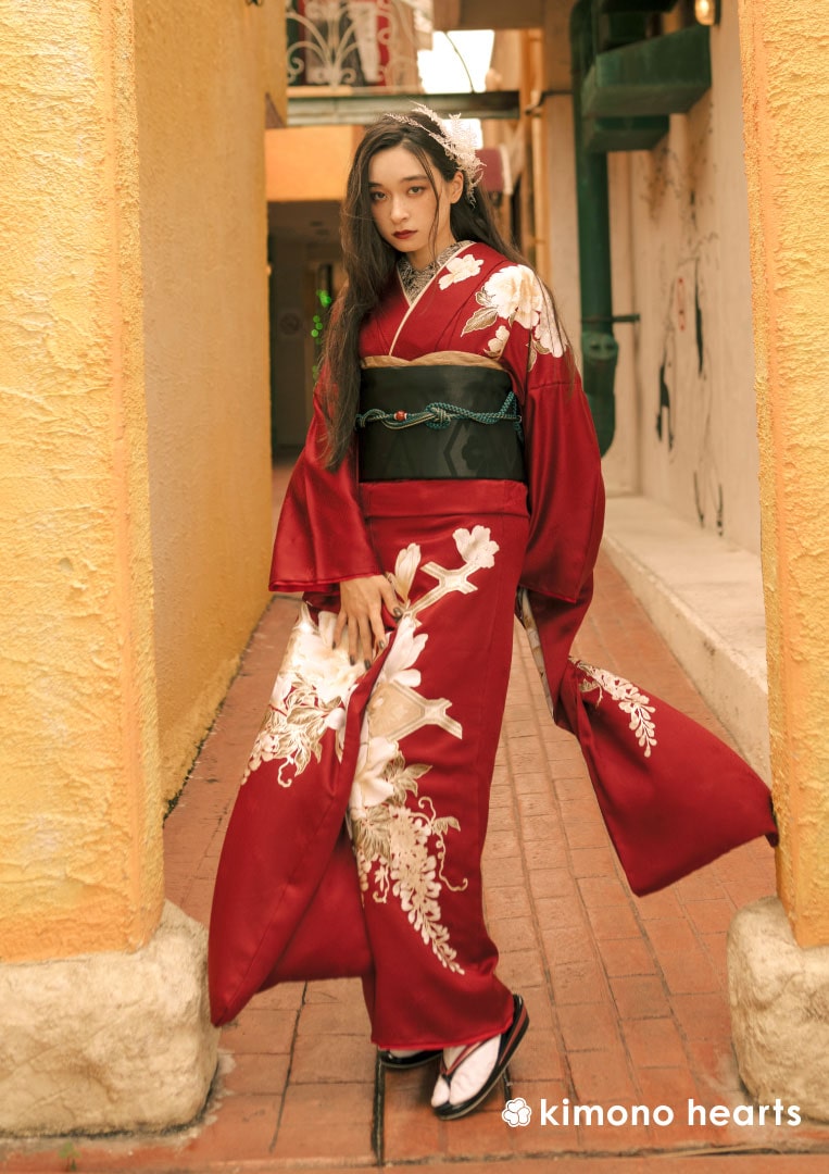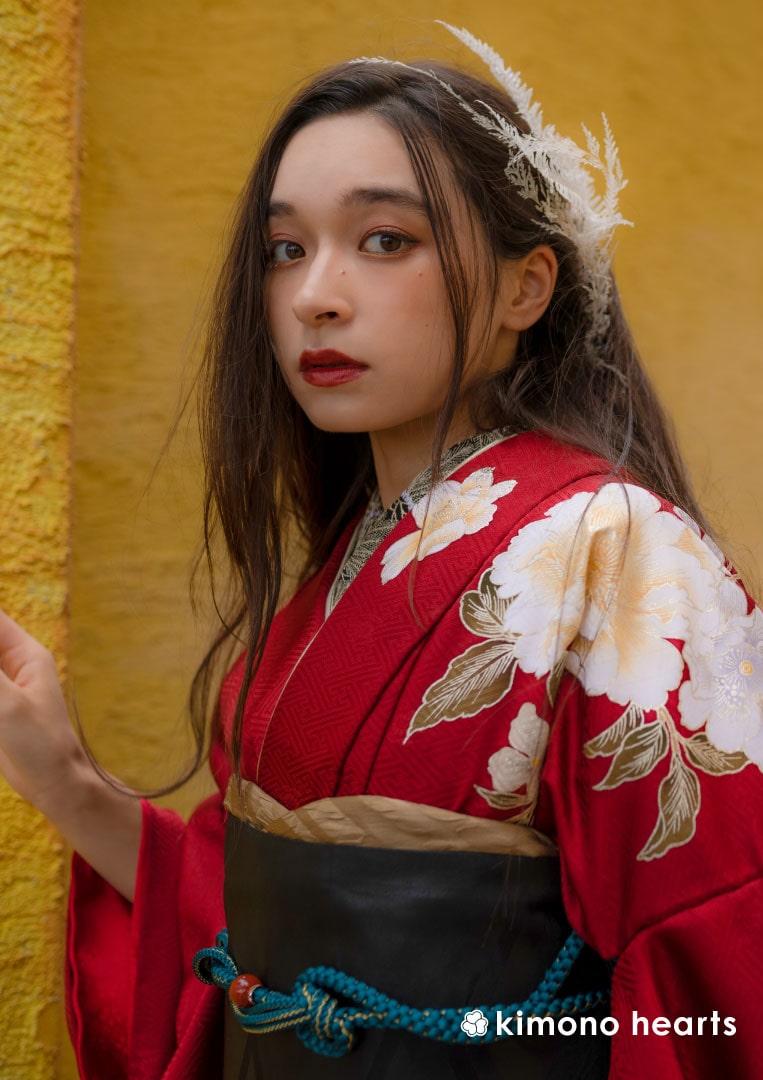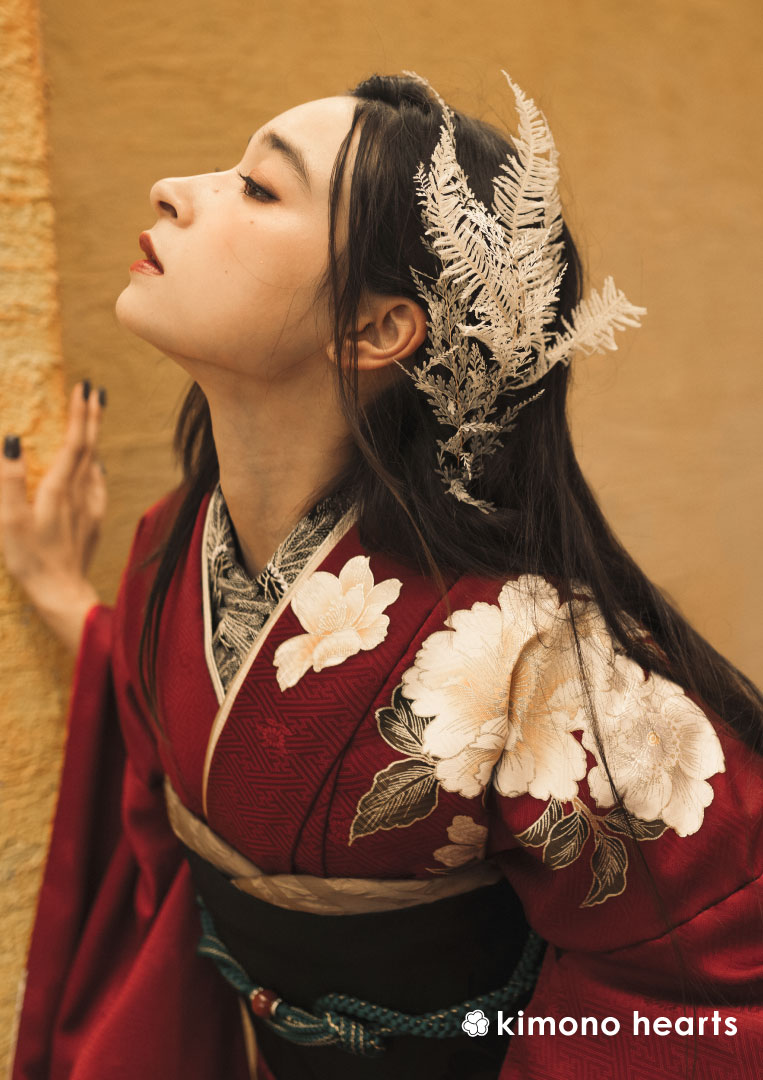 真紅に粛々と咲き誇る牡丹の花。シンプルながらも色味のコントラスト、繊細に描かれている花が鮮烈な存在感を放つ。シックな配色で小物を選んで、洗練されたアーバンスタイルへ。