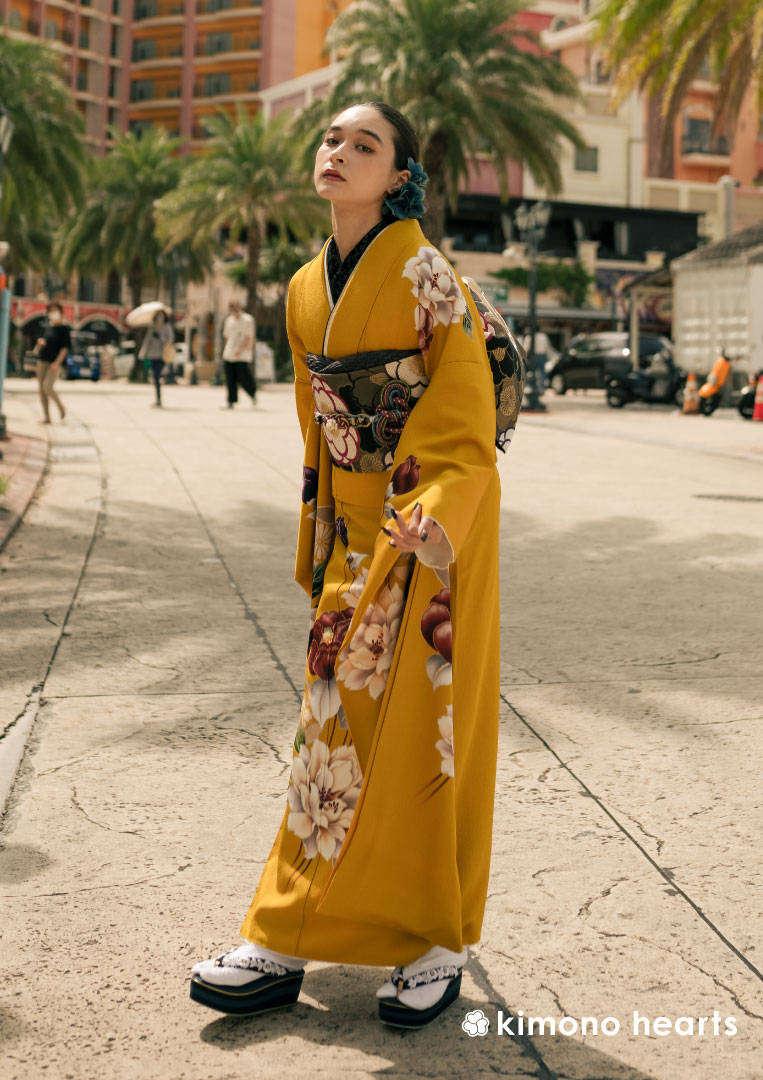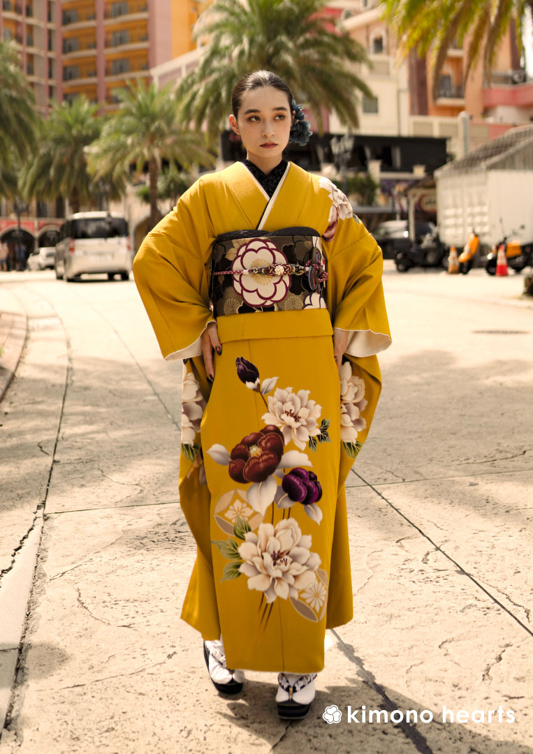 からし色と黄色の中間色に椿や牡丹の大きい花が描かれる モード80'sヴィンテージ KH-420