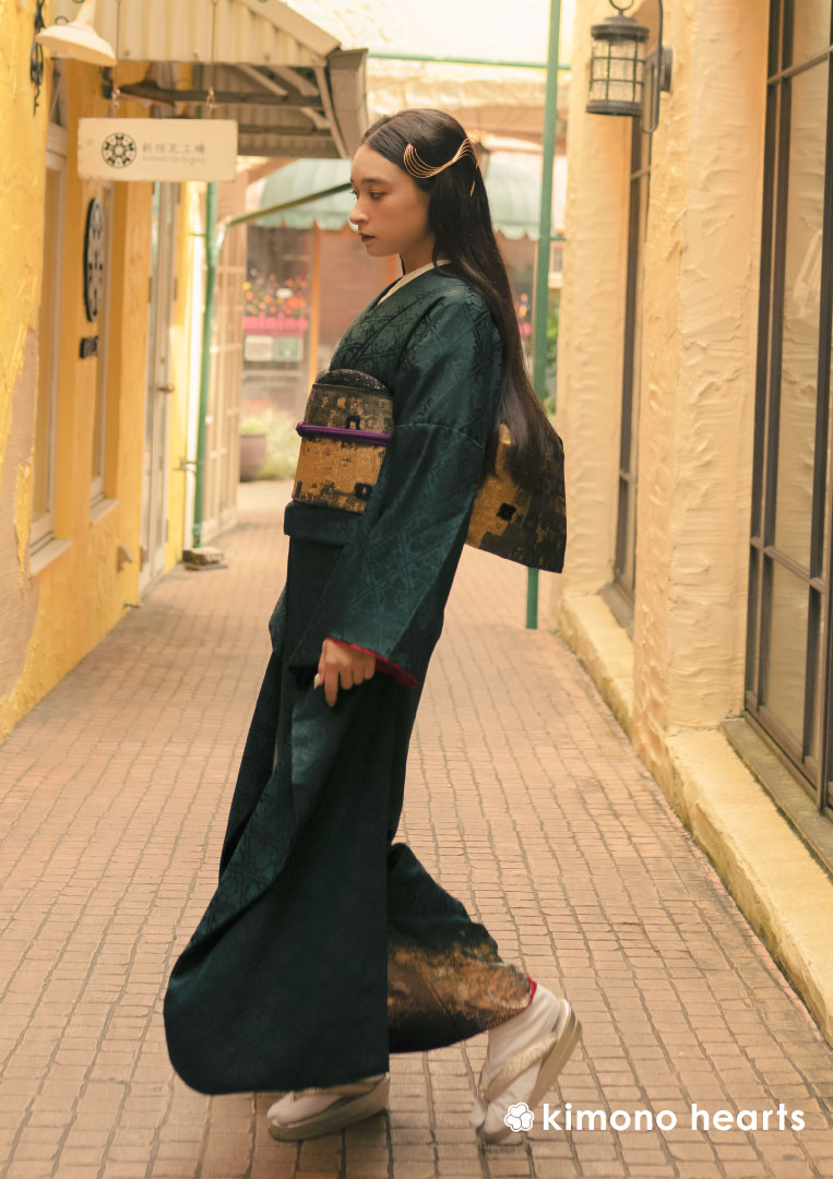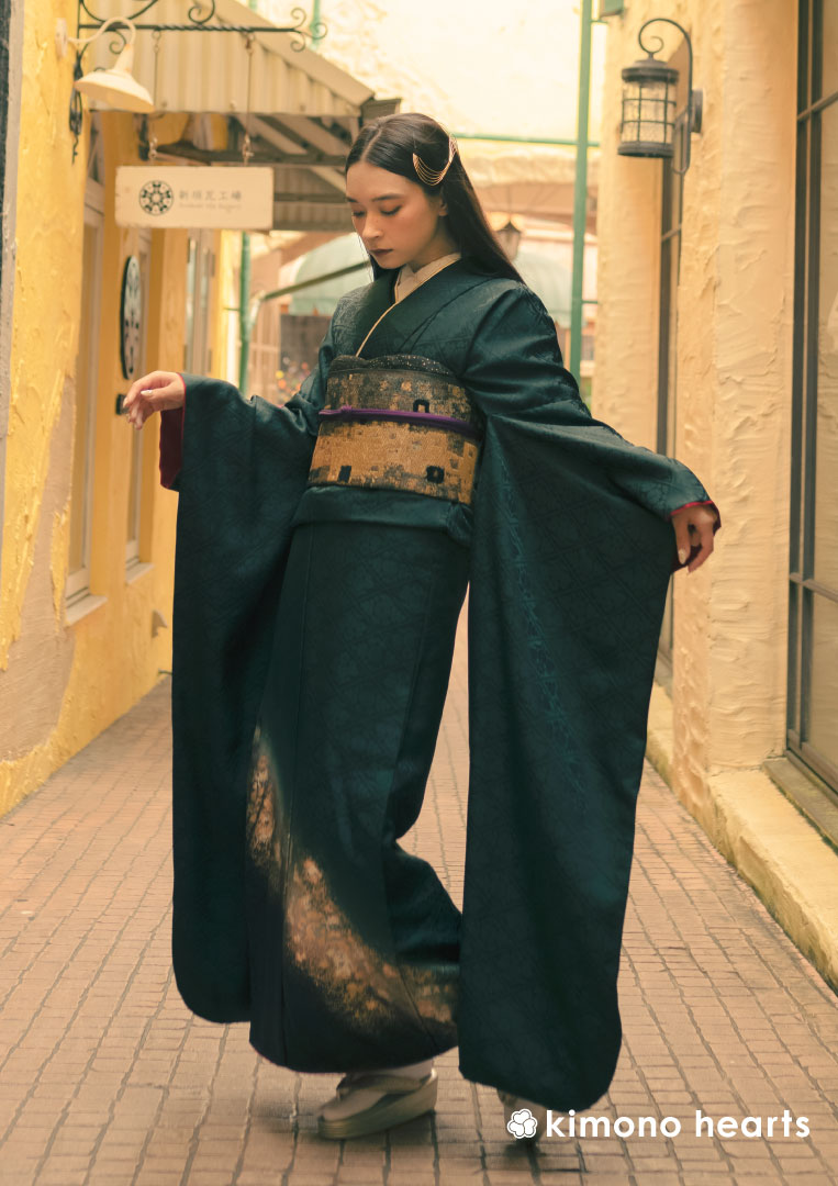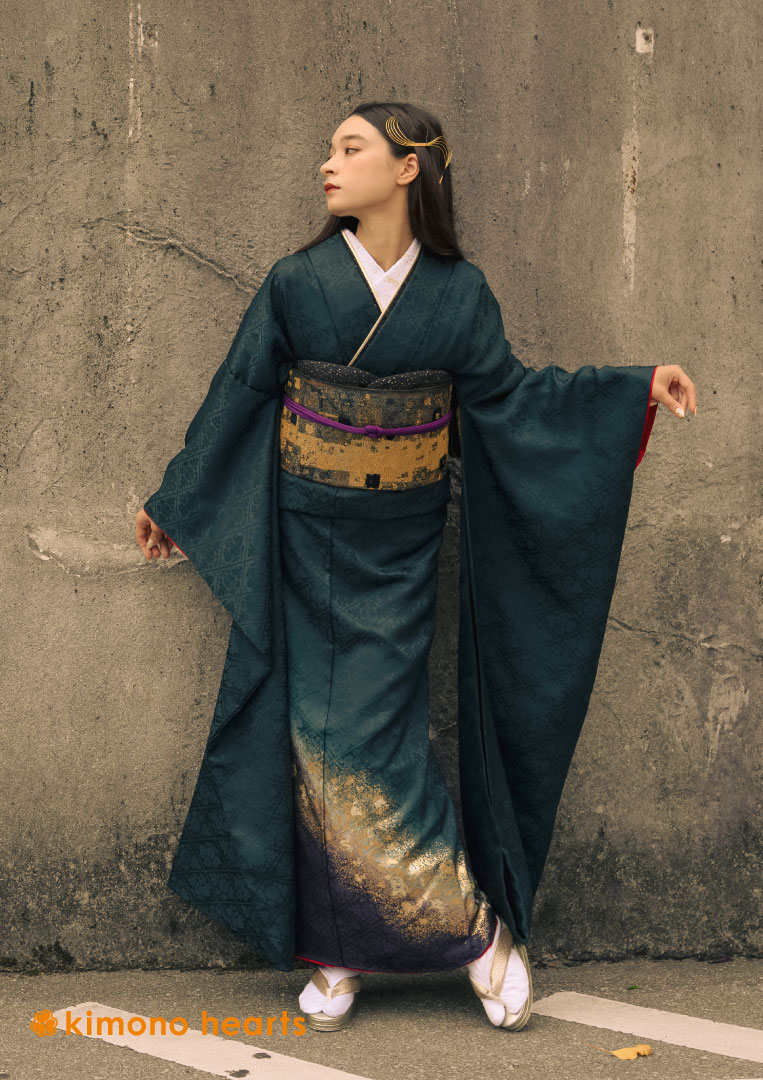 深い緑から黒へのぼかしを金で繋いで。シンプルでシック、ストイックな雰囲気のある振袖。エスニックなテイストの帯でミステリアスなオーラを放ちましょう。コチラの振袖、色違いの振袖もご用意しております。ここだけのシンプルでハイファッションなリンクコーデで成人式に出席されるのはいかがですか?