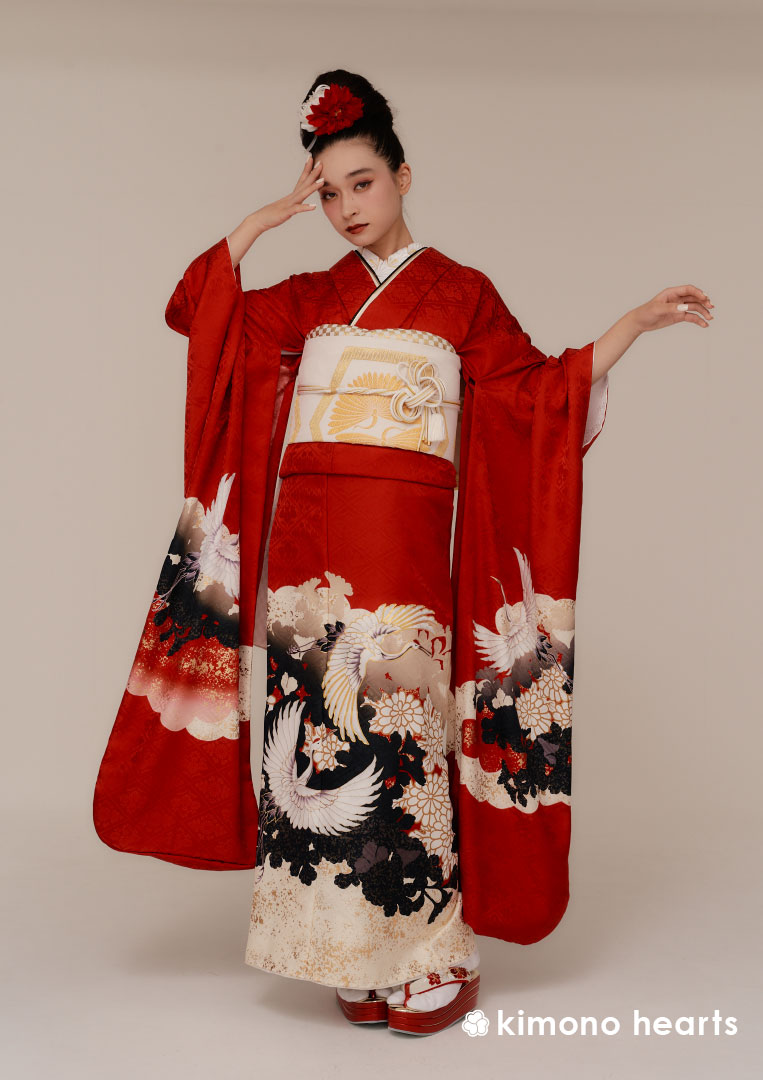 ニッポンを連想させる真っ赤な振袖に躍る鶴。赤×白×黒のコントラストが高い印象的な配色はインパクトがあり日本らしい趣を感じる。市松模様の帯に菊菱の半衿でどこまでもジャパニズムを表現。鮮やかなセルリアンブルーの帯締めをクッと締めるとキリッとクールなジャパネスクが完成。