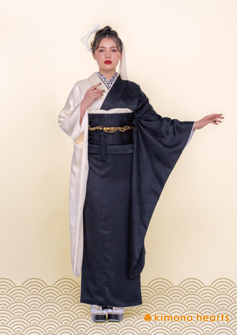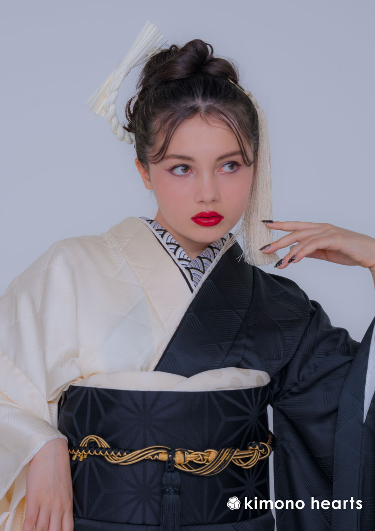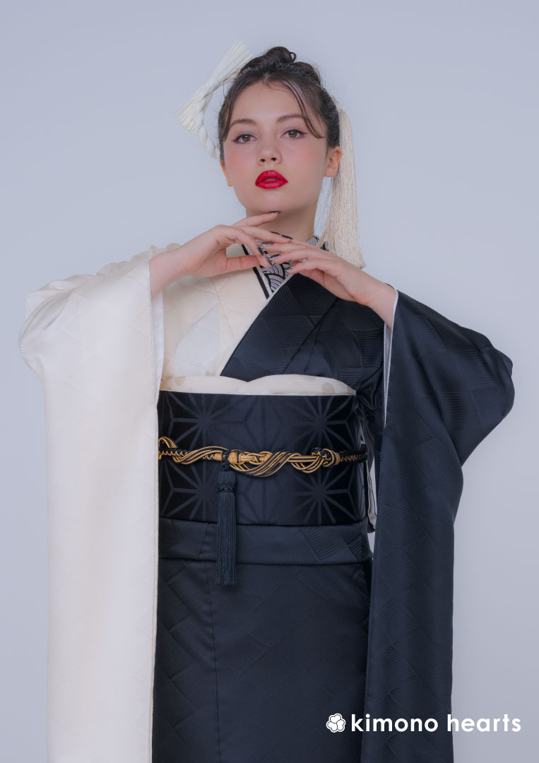 艶やかな白と黒の半身仕立てがシックで上質な雰囲気のキモノハーツオリジナル振袖。重厚感のある黒色の帯にシンプルな小物を合わせれば日本の格式高い仏閣を感じさせるコーディネートに。コチラの振袖、色違いの振袖もご用意しております。小粋なニッポンを感じるリンクコーデで成人式に出席されるのはいかがですか?