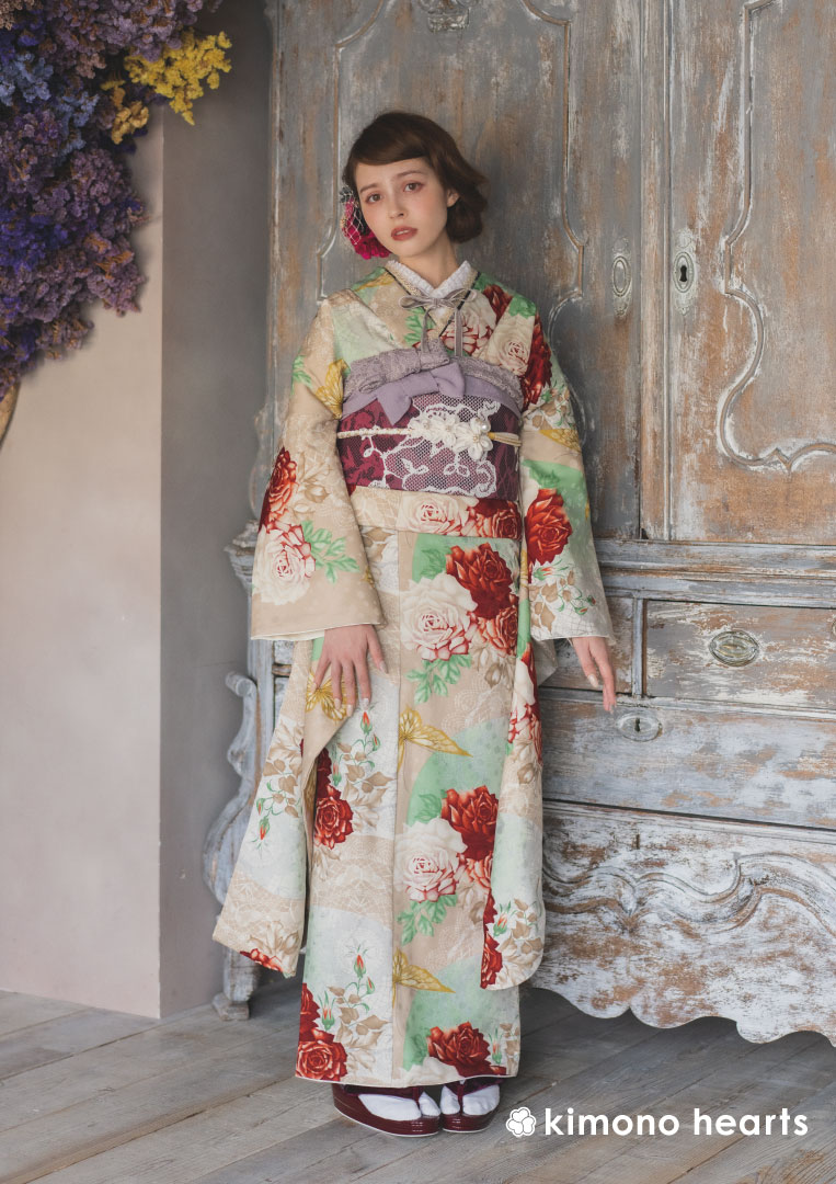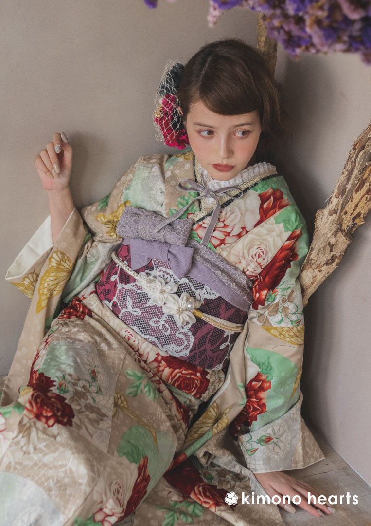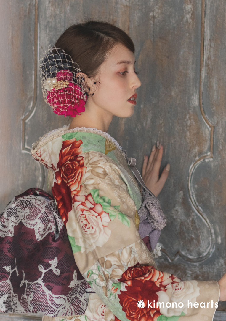 和と洋が合わさった雰囲気には洋風の髪飾りが似合う。大きな花のヘッドドレスやボンネを合わせてクラシカルに仕上げて。