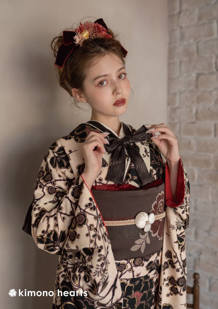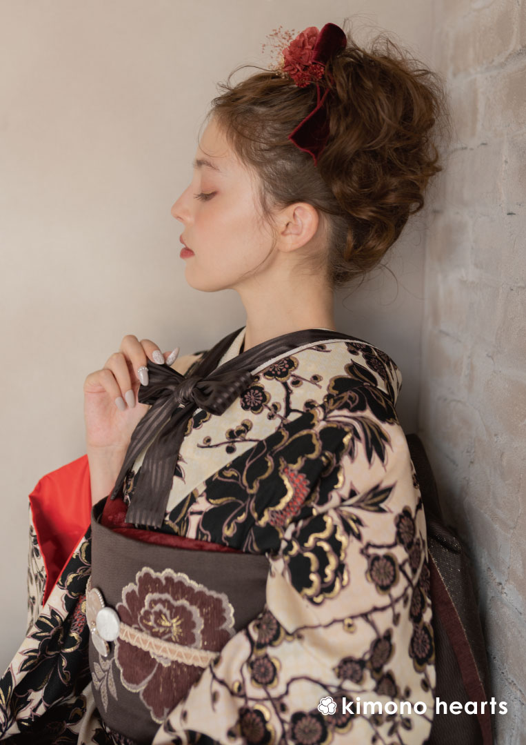 ミルクティー色の振袖に咲くブラックの牡丹や梅、椿がヴィンテージなテイストを漂わせます。