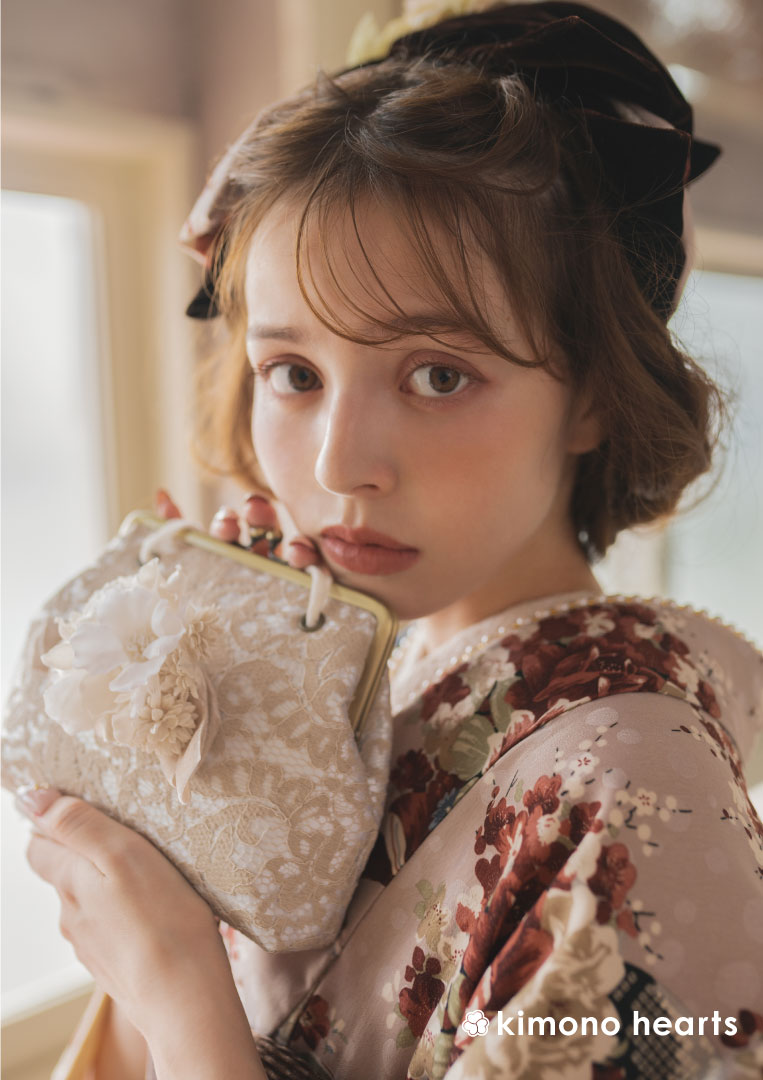 アンティークブーケが紡ぐヨーロピアンなムード。ピンクグレージュにときめく乙女心が詰まった、キモノハーツとっておきの振袖です。