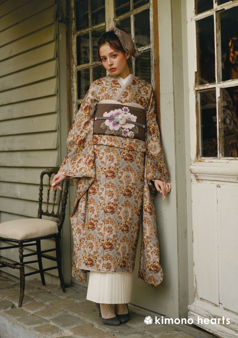くすんだブルーグレーにブラウンの花柄が、どこかヨーロピアンな振袖。レースの帯締めにパールの重衿で雰囲気たっぷりに。キモノハーツオリジナルのこの振袖は貴方だけの個性を引き出してくれます。一生に一度の成人式。誰にも真似できないノスタルジーな雰囲気の装いで。