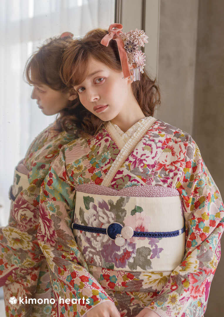 レトロなタイルアートを彷彿とさせる色遣いのグラフィックは牡丹や梅などの日本の名花。全体の色味はくすんだニュアンスカラーでまとめるシャビーシックテイスト。おしゃれで垢抜けた少し甘めのカラーリングはクラシカルな雰囲気に。