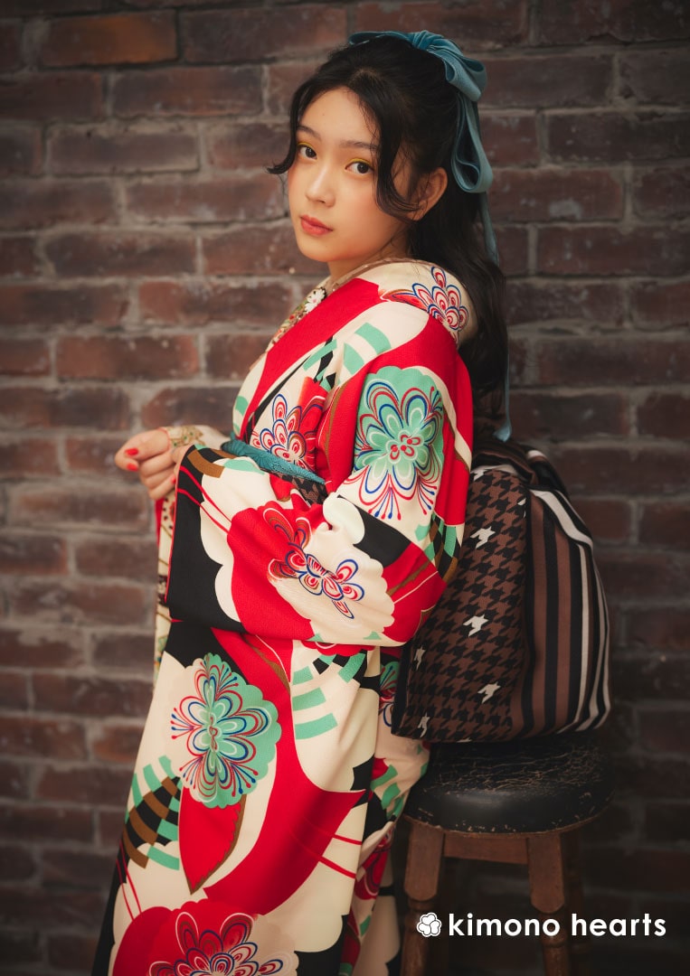 大胆なグラフィックの半身仕立て振袖。