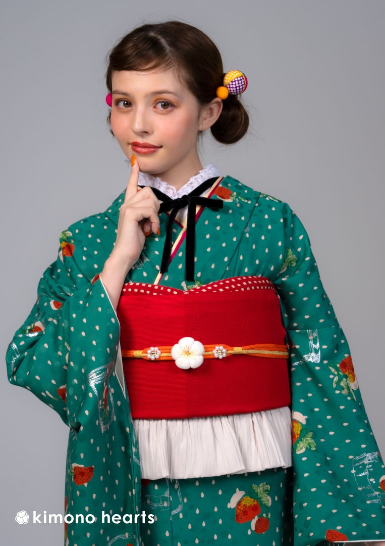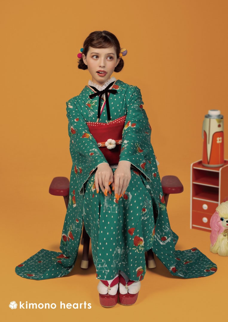 きゅんとときめくイチゴ柄はキモノハーツのオリジナル振袖。よく見てみると瓶の中にイチゴがコロコロと入っていて、なんだか愛らしい。レトロな色味に心躍るキュートなデザインでとびきり可愛いレトロガールへ。気分はメルヘンの童話の住人!いつまでも、私らしくいましょうね。