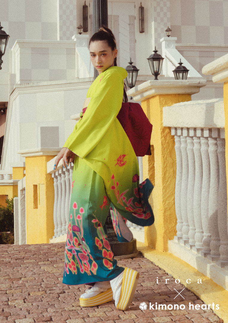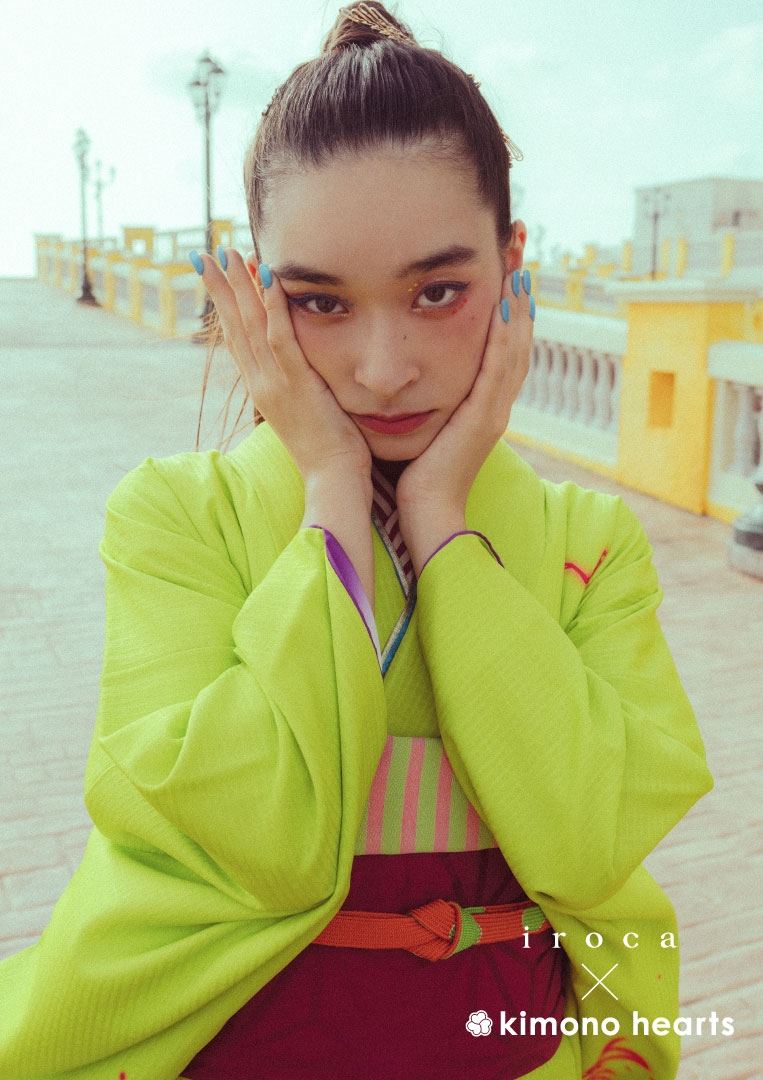 irocaとキモノハーツが創る、新しい振袖との出会い。目を引く蛍光カラー、毒々しさすら感じるきのこ。 振袖の放つ色香をそのままに、シンプルな小物合わせで魅せる私だけのハタチの姿。