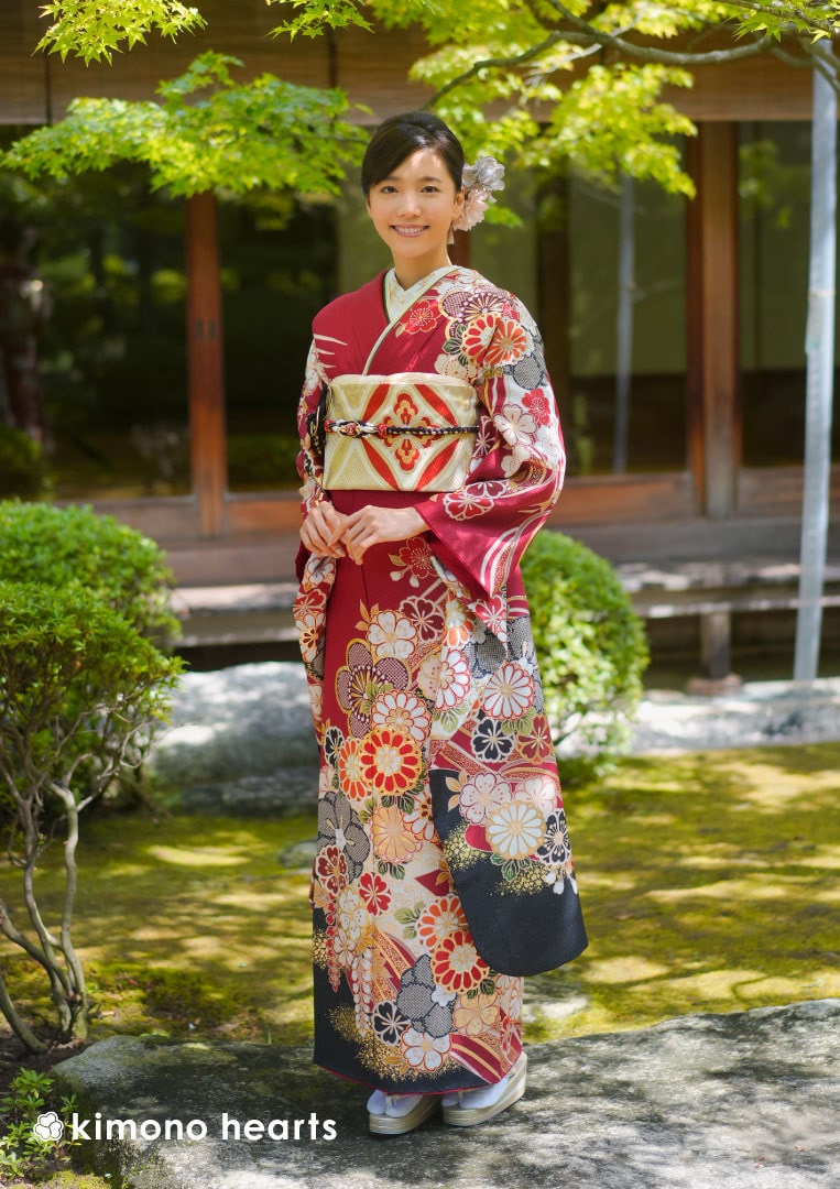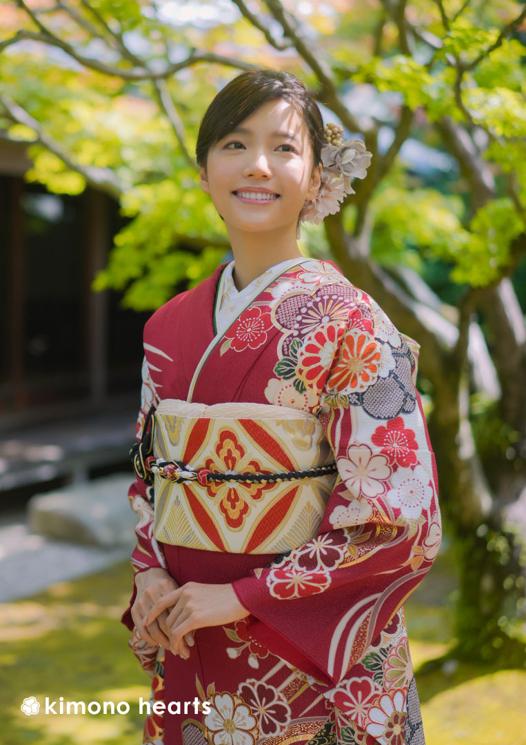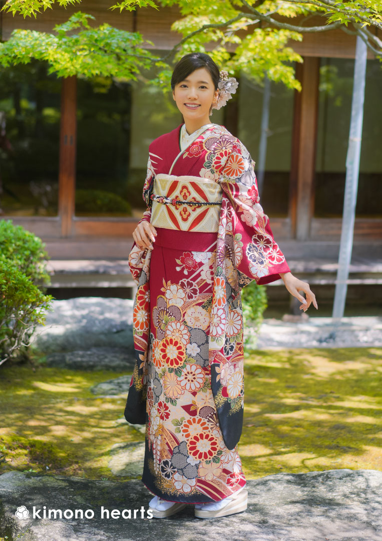 人気の高い赤色に、こちらも長く愛される日本の名花を組み合わせた王道古典振袖。菊や梅、桜や藤など祝儀には欠かせない文様には長寿や繁栄など多くの願いが込められている。花々の合間には波文様が描かれ、大きな一枚絵に動きが表現される。帯の七宝柄、重衿の色など小物にも古典的な図柄、色をもちいて二十歳の門出にふさわしい装いの完成。