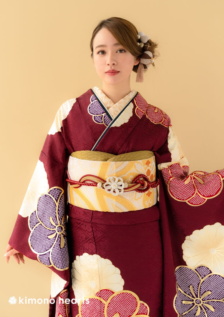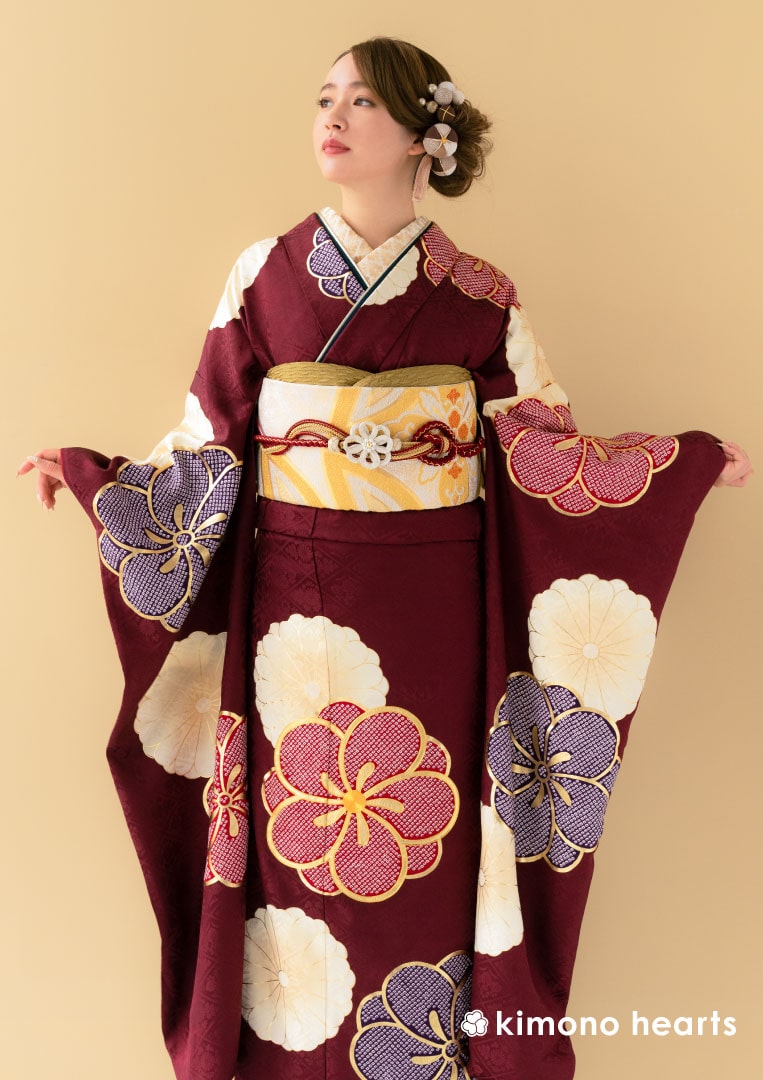 深みのあるえんじ色に、ころんとした梅と菊が描かれなんとも愛らしい。赤色と紫色の梅には鹿の子模様が浮かび、さらに金駒刺繍で縁取ることにより伝統技法で特別な一日を彩る。温かみのある色味の菊と揃えた帯が全体の統一感を増す。半衿は振袖の地模様と着合わせの良い色を選び、お顔周りを華やかに演出。