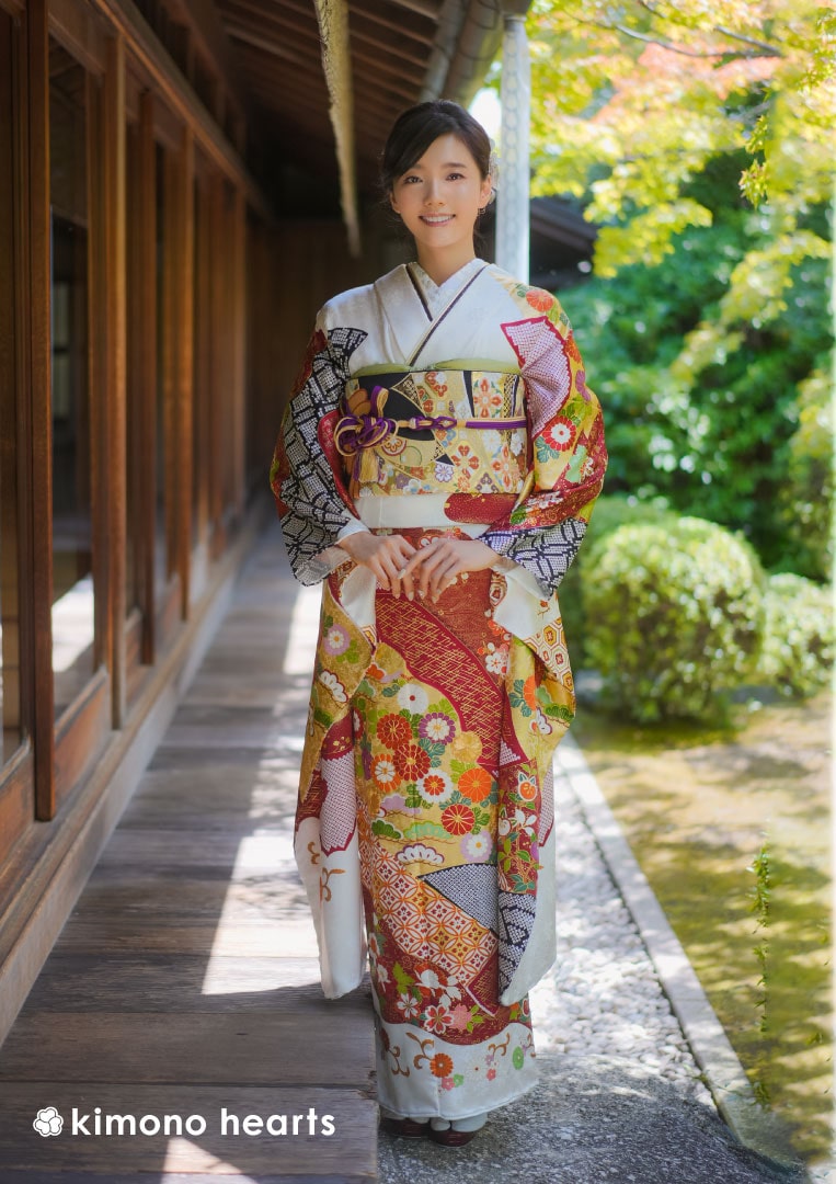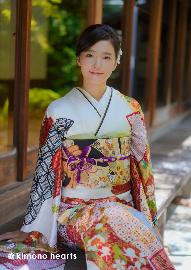 白地に赤で晴れ晴れしく描かれた菊花や七宝柄が華やか。 白の雲取りが壮麗で清々しい。 伝統を豊かに取り入れた振袖は、一度きりの晴れ舞台に相応しい。