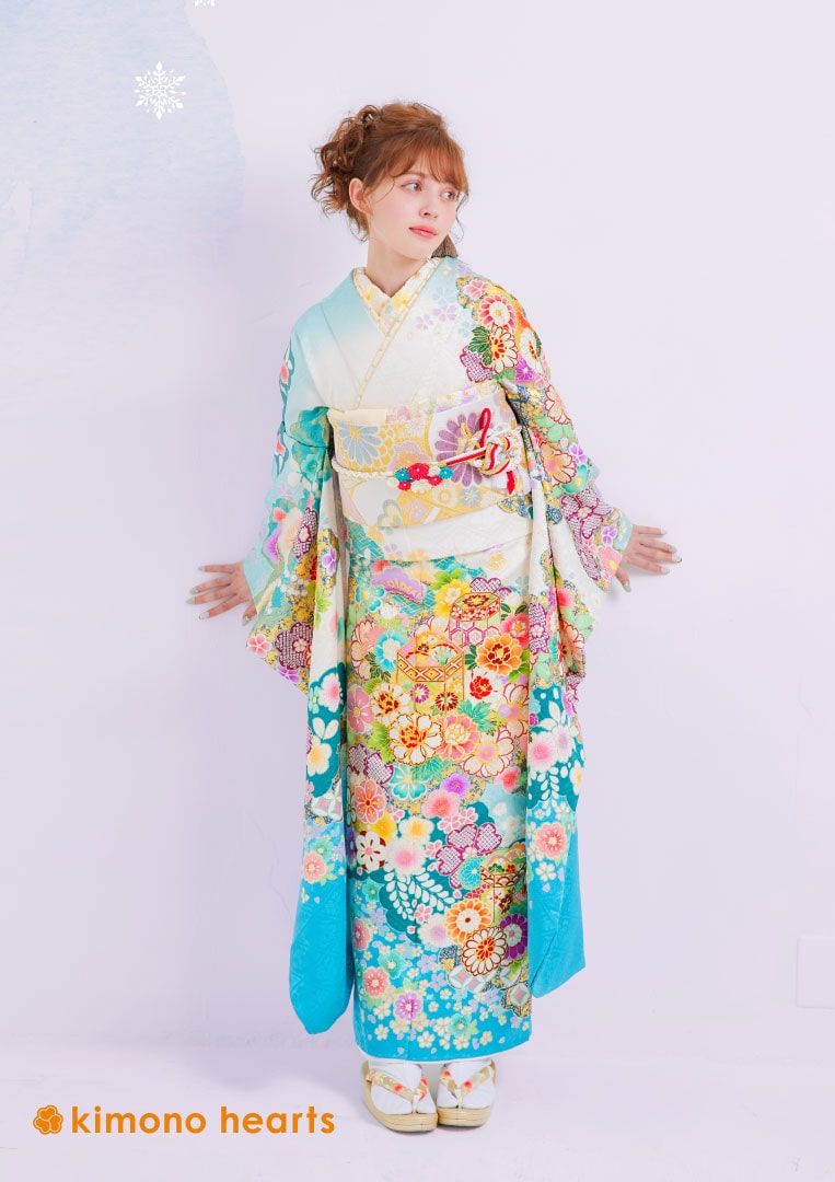 大人への一歩を踏み出す晴れの日をフレッシュな装いで。淡い水色から青緑へのグラデーションが美しい振袖です。