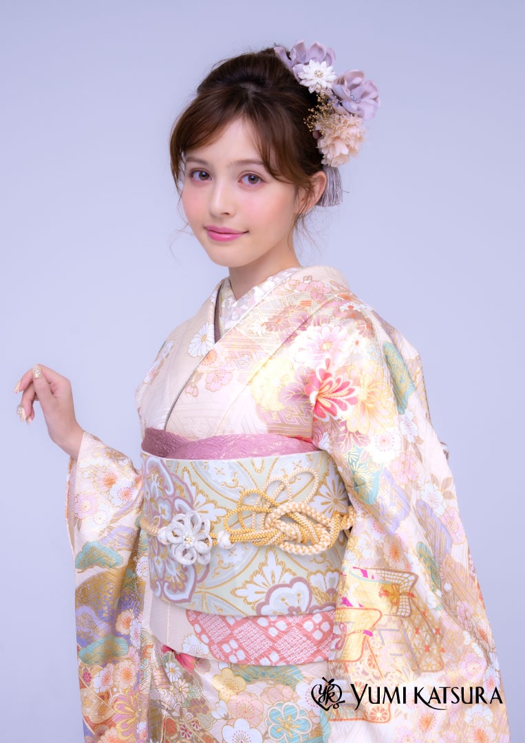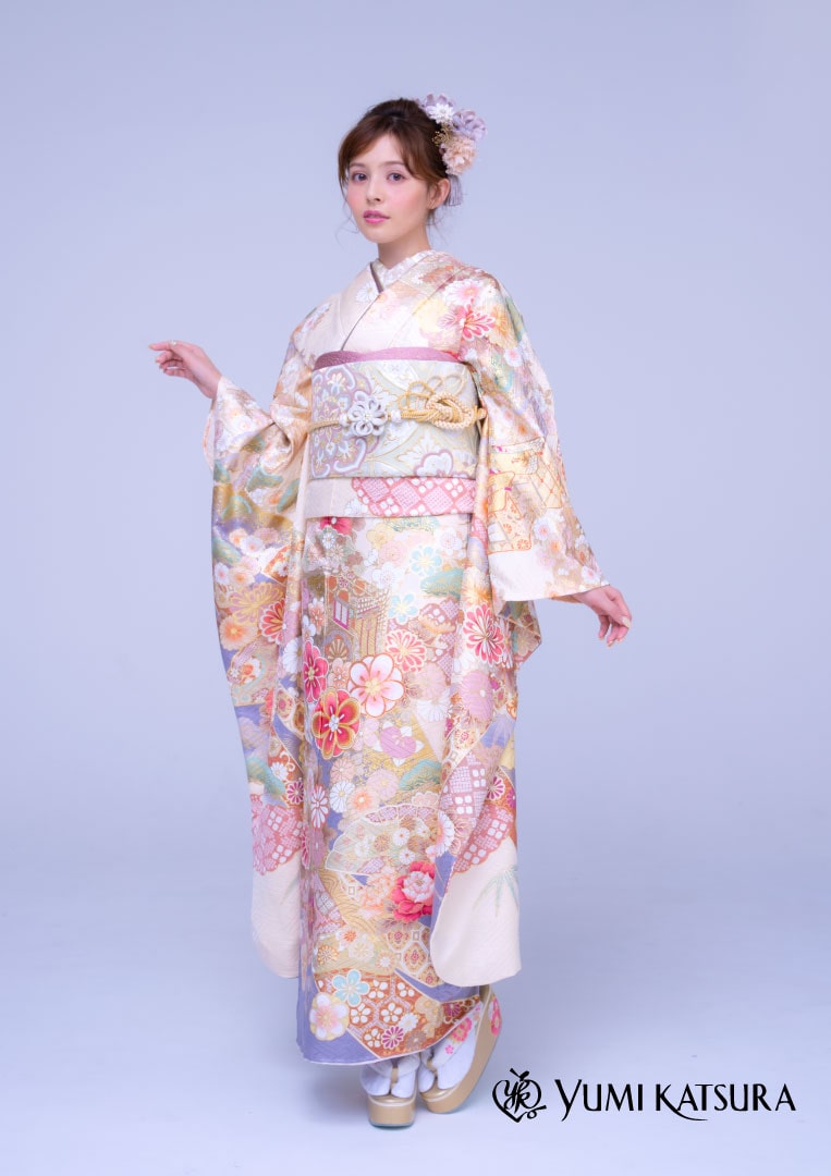 女性を美しく魅せる技を知り尽くしたウエディングドレスのトップランナー、YUMI KATSURAブランドの振袖です。