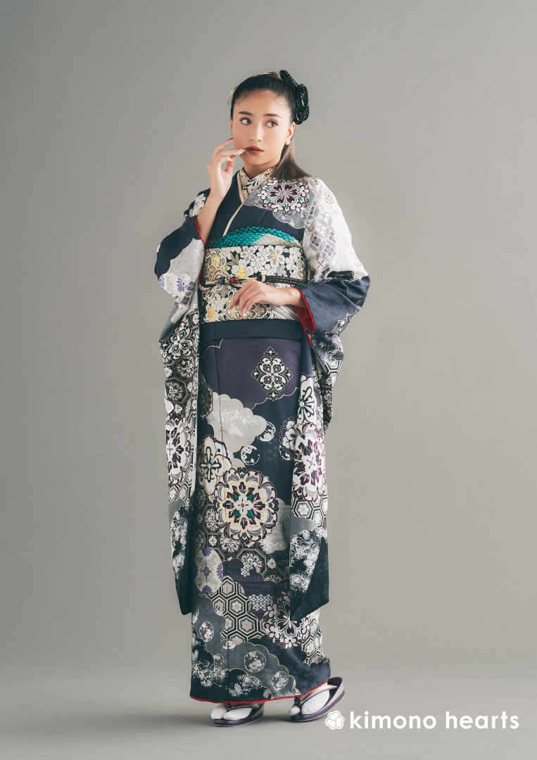 和と洋どちらの良さも併せ持つ風雅なデザイン。ブルーグレーと白のモノトーンを基調としながらも全身に散りばめられたエキゾチックな花紋や吉祥文様が晴れやか。控えめな金色も美しく女性の格をあげてくれます。
