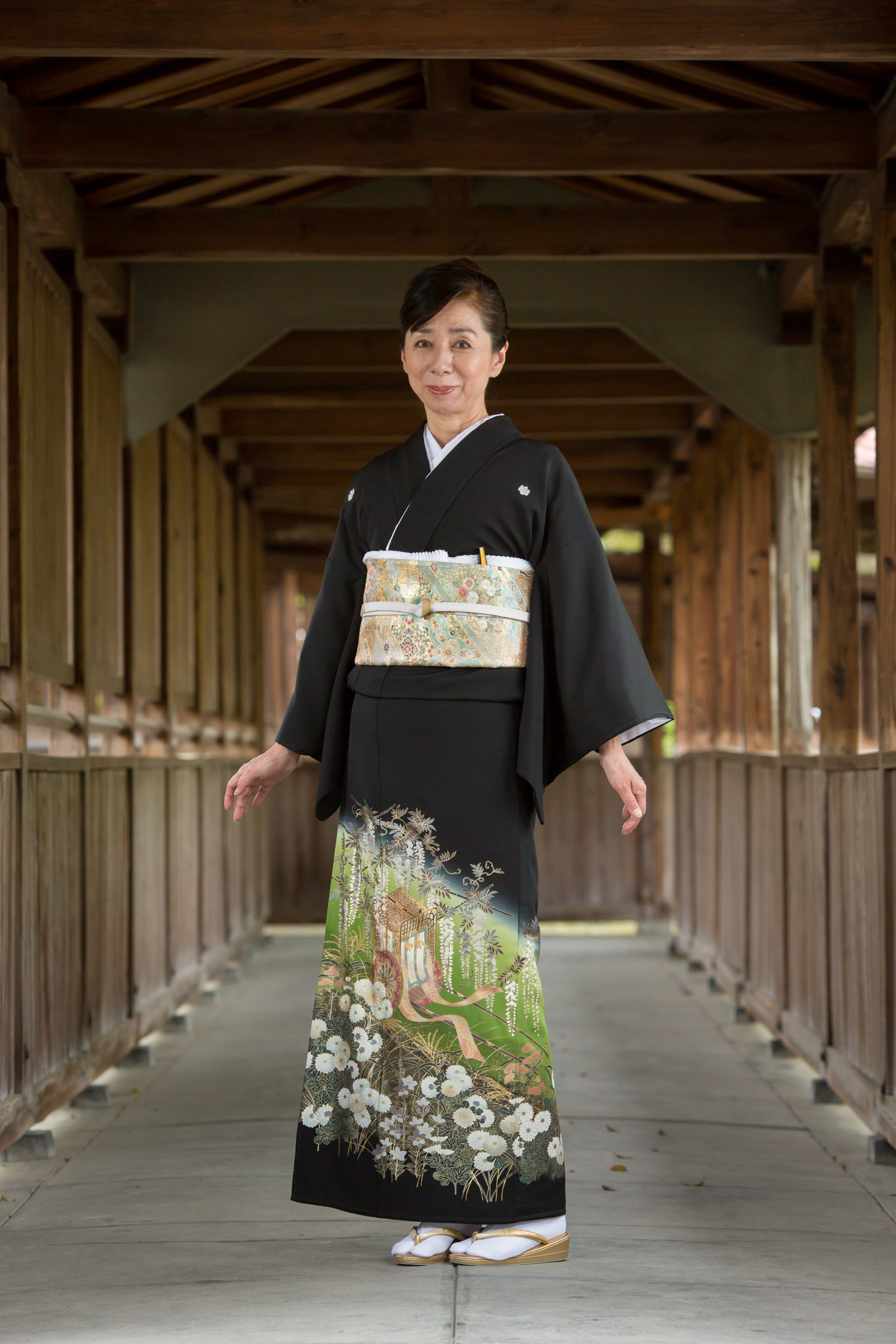 留袖と帯、着付けに必要な小物まで一式揃ったレンタルセットです。丹後ちりめんの生地を使用し「ヒワ暈し 御所車に藤 菊」と題されたこちらの作品。ヒワ暈しと珍しい色調で、金の御所車に藤や菊を豪華にあしらわれた幅広い年代にお勧めの留袖です。