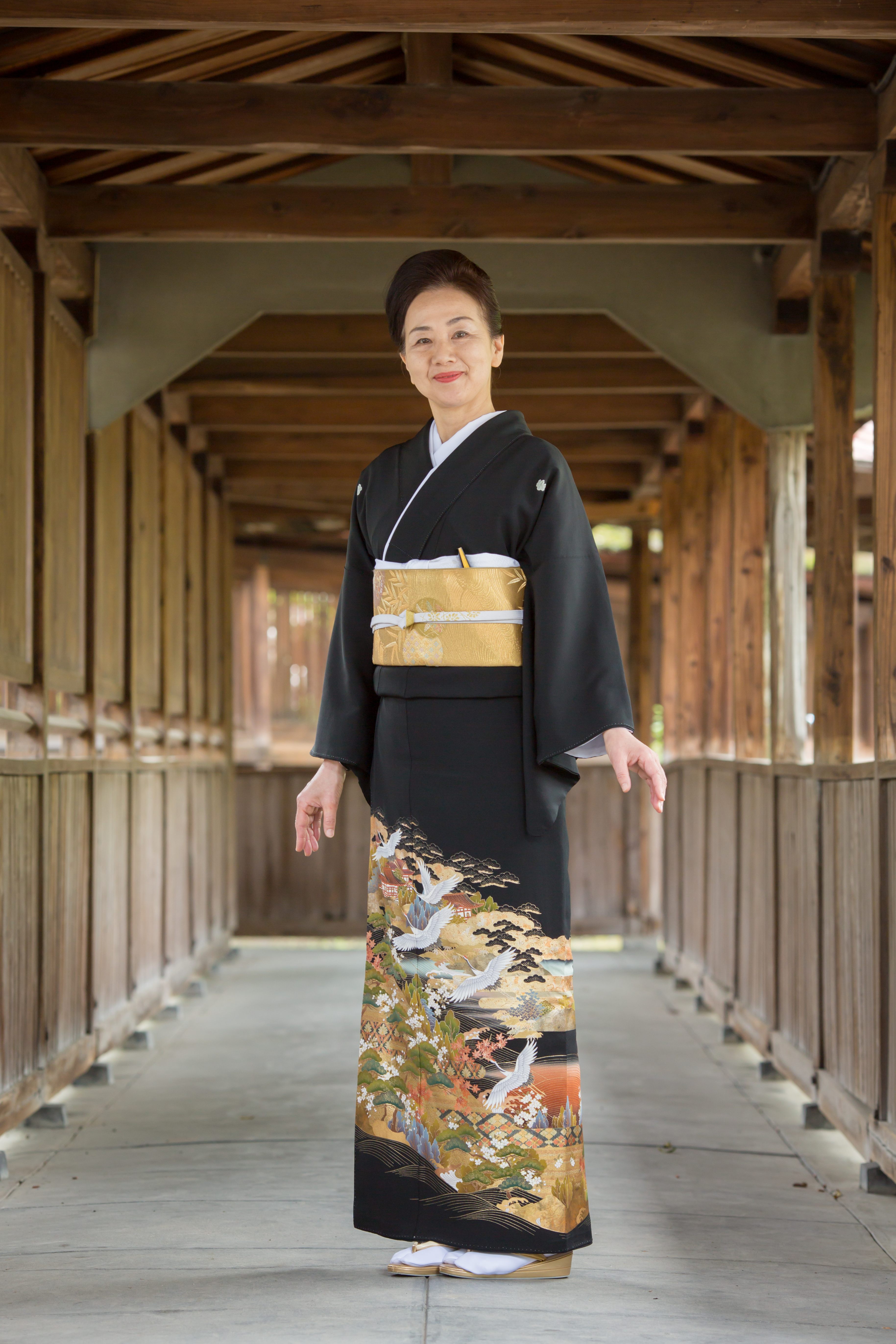 留袖と帯、着付けに必要な小物まで一式揃ったレンタルセットです。最高級丹後ちりめんの生地を使用し「御所解に鶴」と題されたこちらの作品。豪華な金箔の御所解き文様におめでたい鶴を配しました。金の雲どり柄がさらに豪華さを増しています。