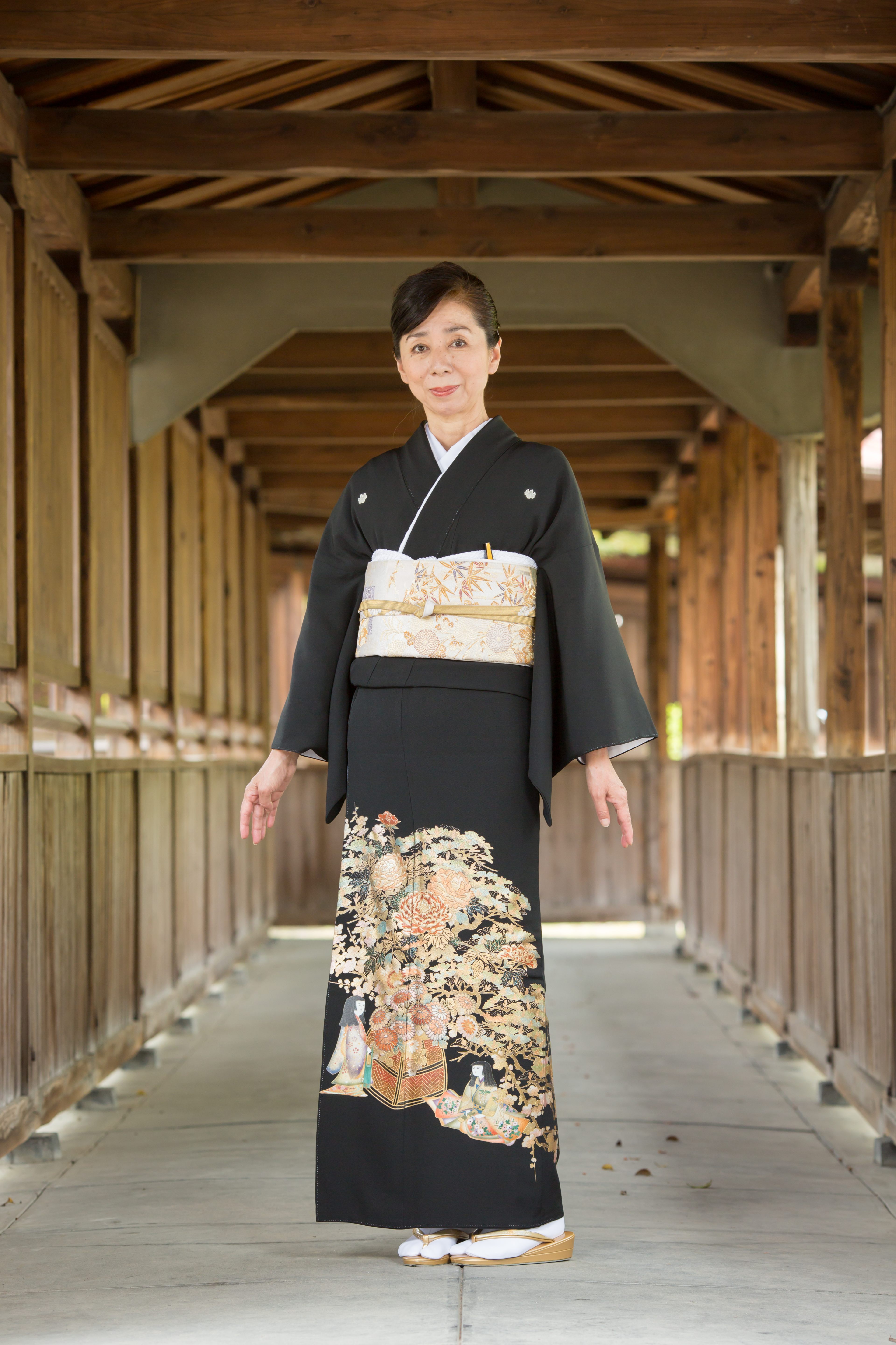 留袖と帯、着付けに必要な小物まで一式揃ったレンタルセットです。丹後ちりめんの生地を使用し「金箔 花かご わらべ人形」と題されたこちらの作品。金箔の濃淡で花篭には牡丹や松竹梅など豪華にあしらわられ、かわいい童人形が描かれた留袖です。