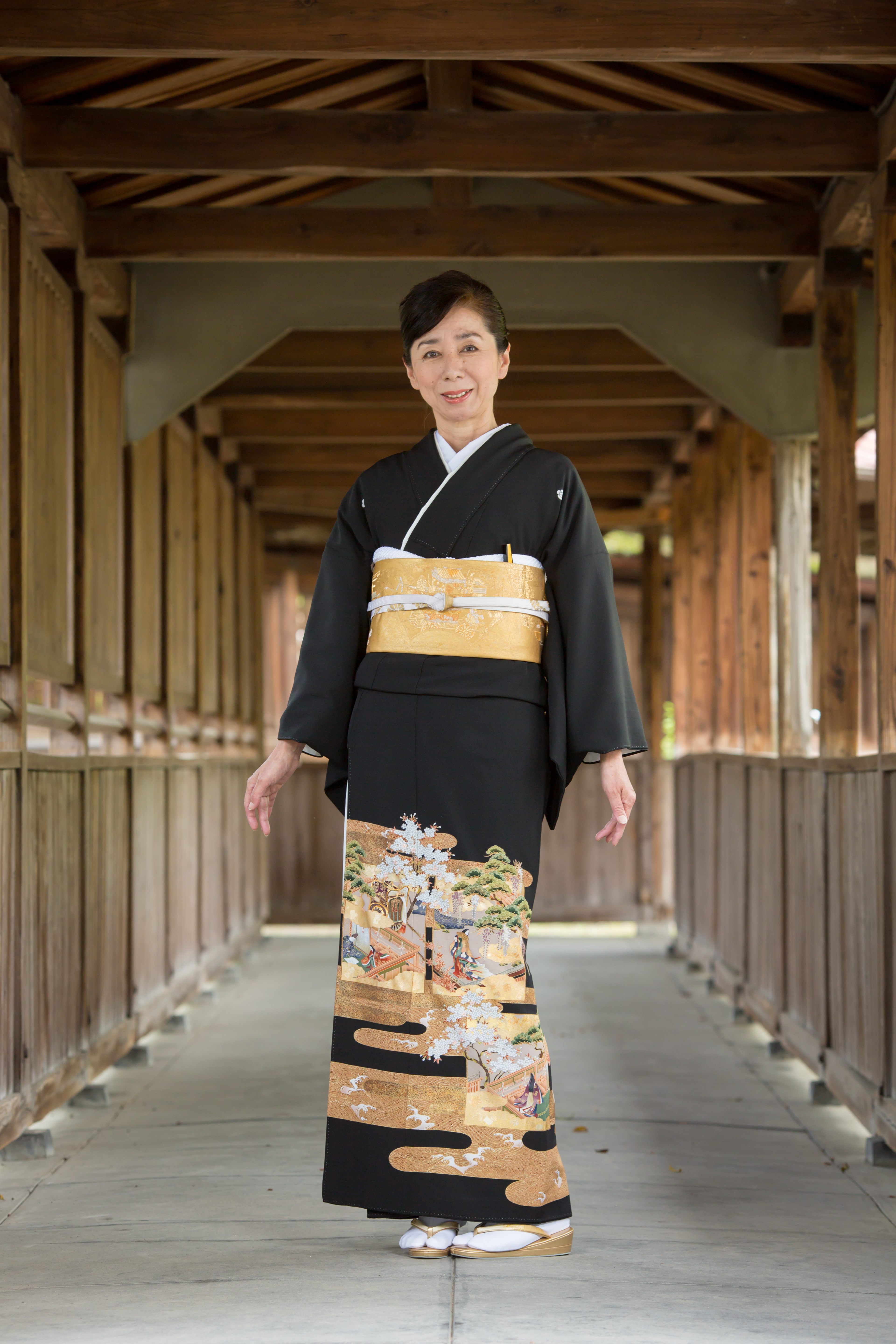 留袖と帯、着付けに必要な小物まで一式揃ったレンタルセットです。最高級丹後ちりめんの生地を使用し「御所解」と題されたこちらの作品。御所解の風景文様に適されている霞雲を背景に源氏物語を想起させる風景の商品です。
