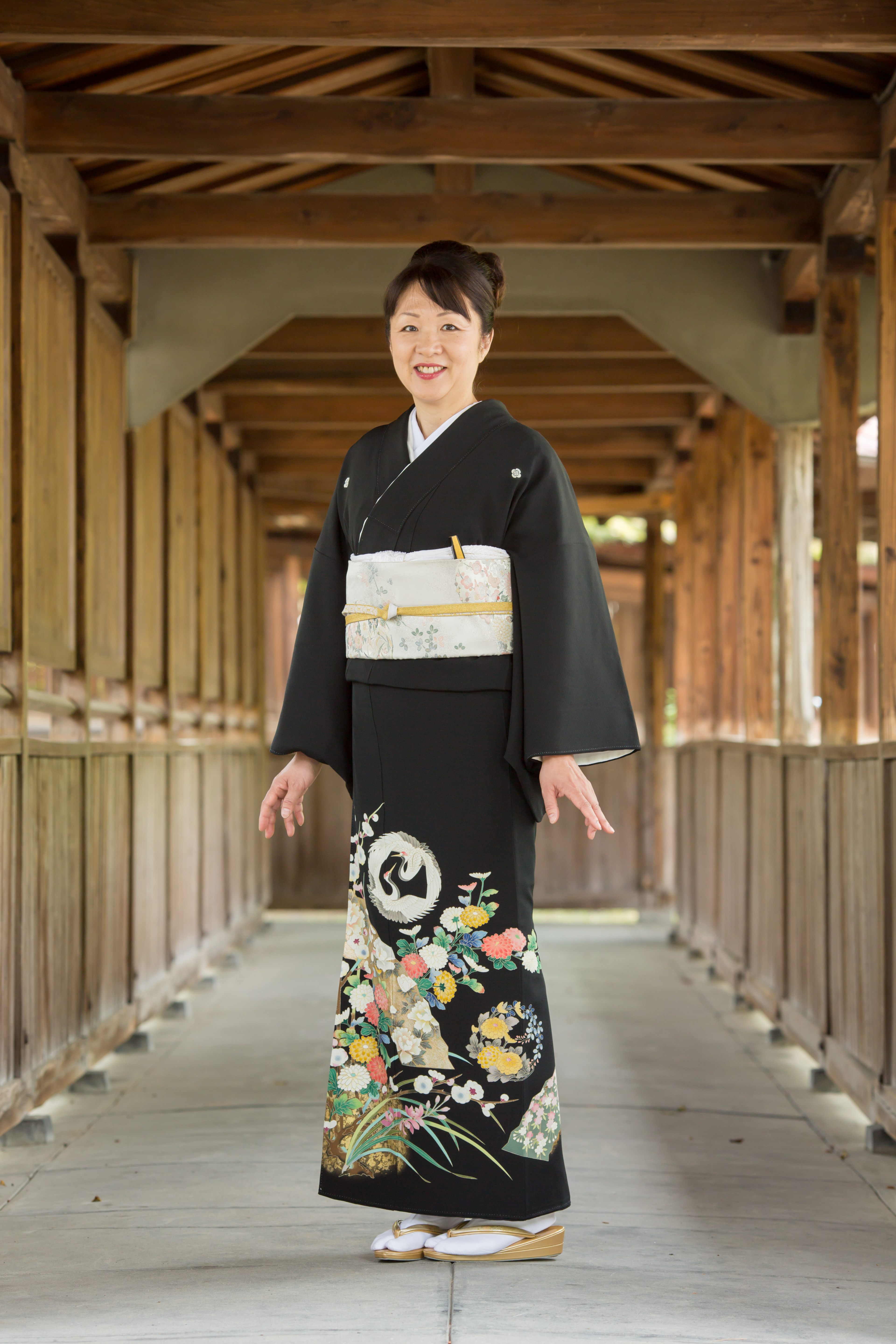 留袖と帯、着付けに必要な小物まで一式揃ったレンタルセットです。「向かい鶴に扇面」。おめでたい文様の向鶴が夫婦睦まじく描かれております。扇面には、菊、桜、梅などの四季折々の花々が優美で華やかさをだしています。