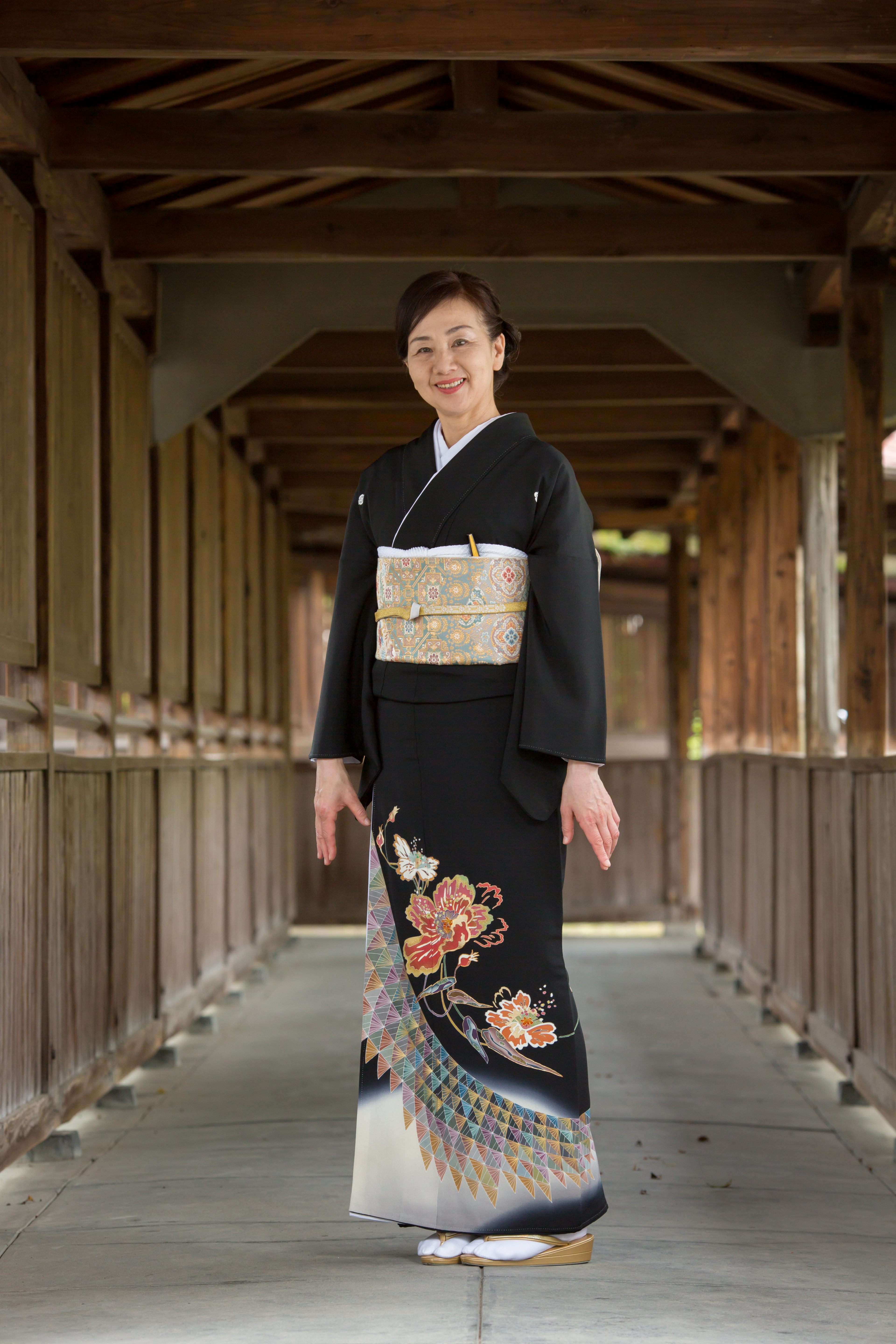 留袖と帯、着付けに必要な小物まで一式揃ったレンタルセットです。最高級丹後ちりめんの生地を使用し「白暈し ケシの花」と題されたこちらの作品。落ち着いた配色の鱗文様に京野菜をイメージした柄が描かれています。ケシの花がインパクトのある留袖です。
