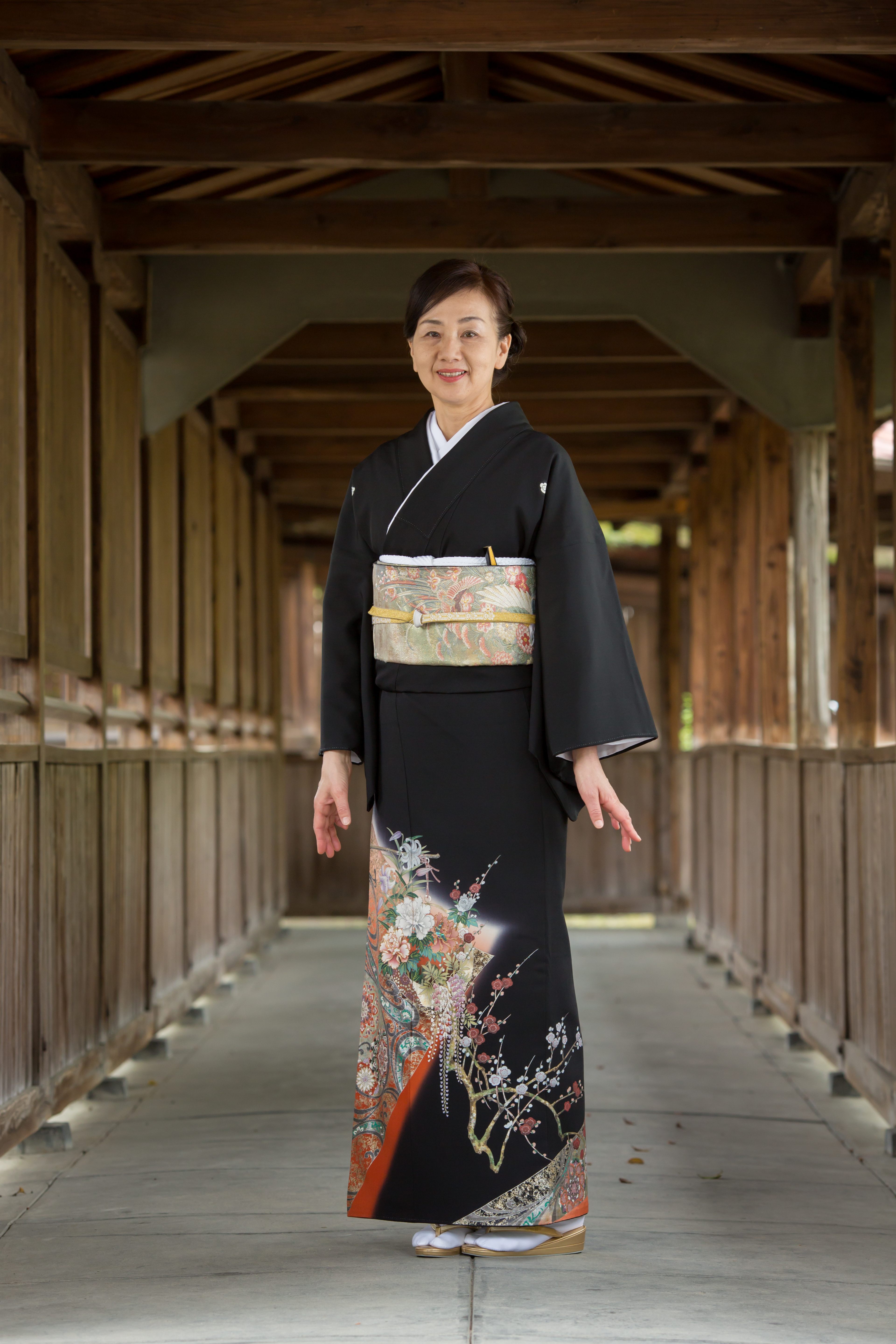 留袖と帯、着付けに必要な小物まで一式揃ったレンタルセットです。「菱に花かご」。背景に菱形の朱暈しを配し、牡丹、百合、藤の花篭で、豪華で華やかな留袖です。モダン柄と古典柄をうまく調和させたお着物です。