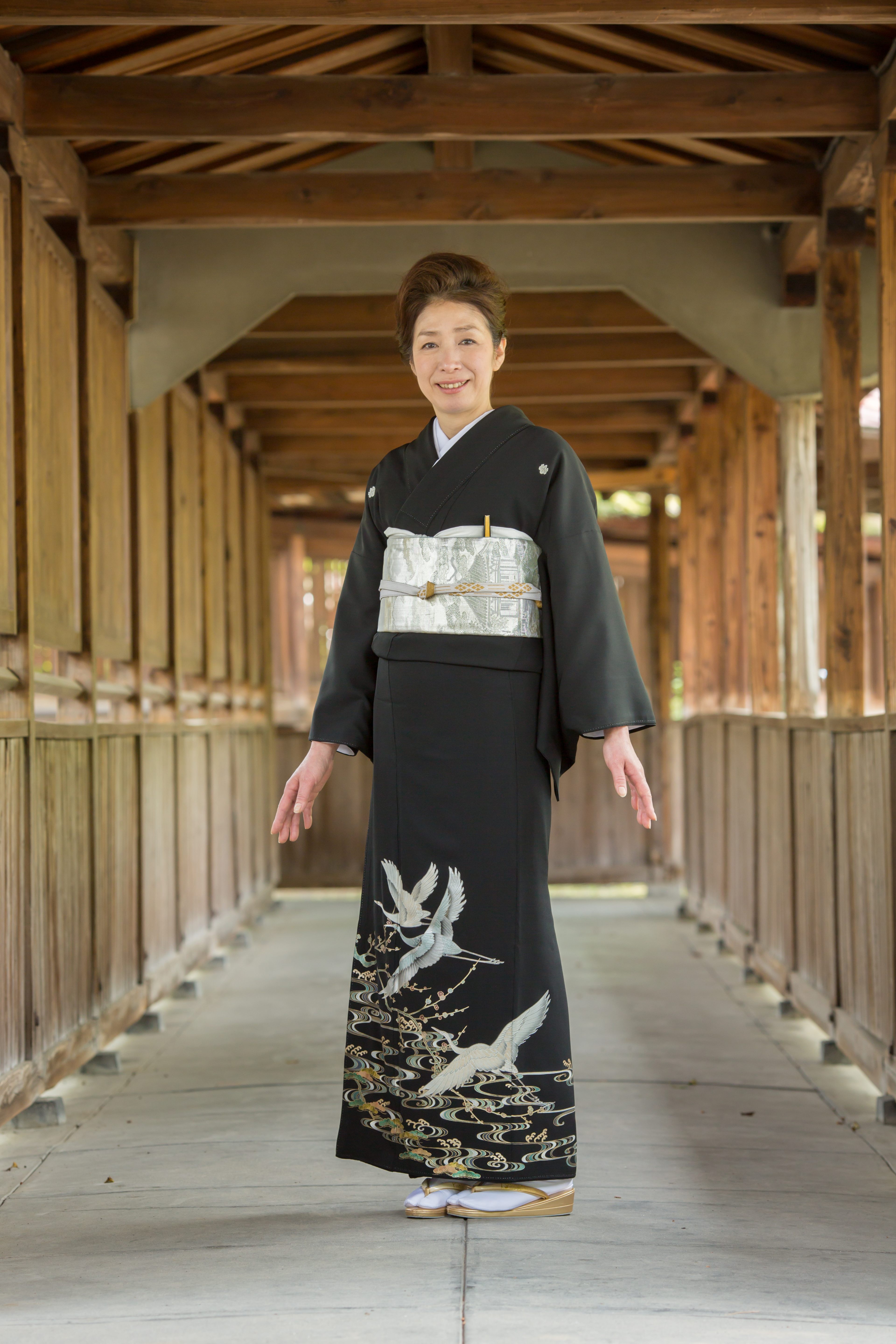 留袖と帯、着付けに必要な小物まで一式揃ったレンタルセットです。丹後ちりめんの生地を使用し「流水に鶴 松」と題されたこちらの作品。格調ある古典文様の観世水の上に鶴をあしらった上品な留袖です。