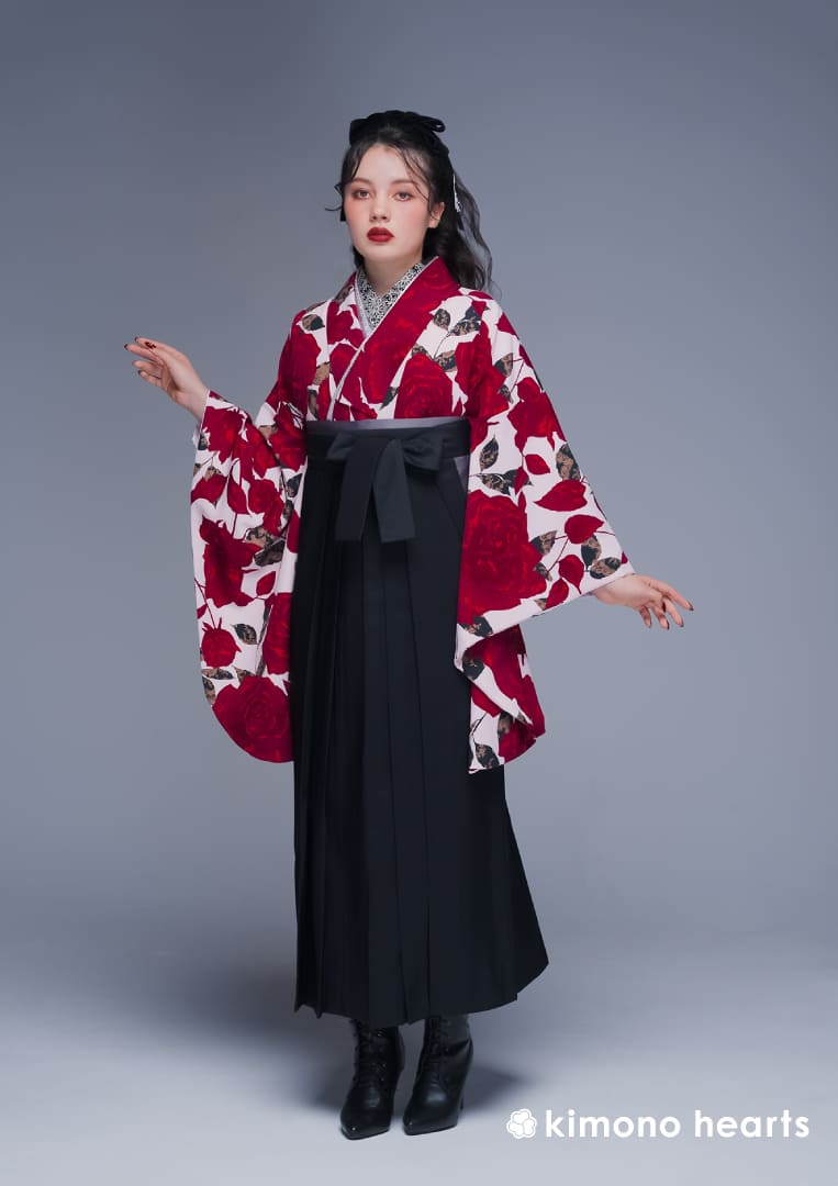 薄いピンク地に華やかに咲き誇る真紅のローズ。 古くから「愛と美の象徴」とされる華麗な薔薇を全身に纏って。