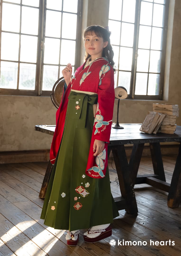 マゼンタピンクにシアンブルーで象られた梅が目を引くキモノハーツオリジナルの二尺袖。 七宝文様と桜がかわいい深緑の袴を合わせて。